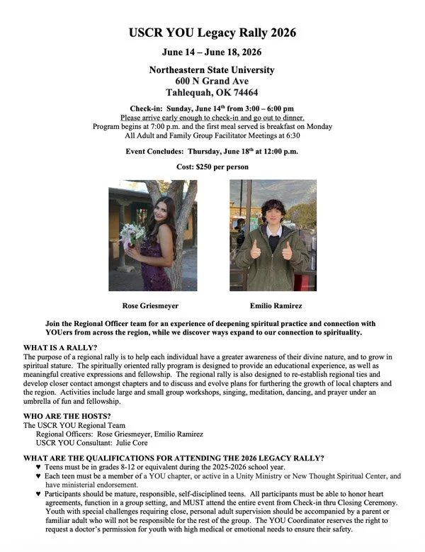 Hi! My name is Rose Griesmeyer, and I’m from New Mexico, in the South Central Region. I’ve been attending Unity Church since I was six years old, and it has been a constant, grounding presence throughout my life. Unity is where I’ve always felt supported, accepted, and encouraged to grow into my authentic self. I’m currently a junior in high school, and Unity has played a huge role in shaping who I am today.